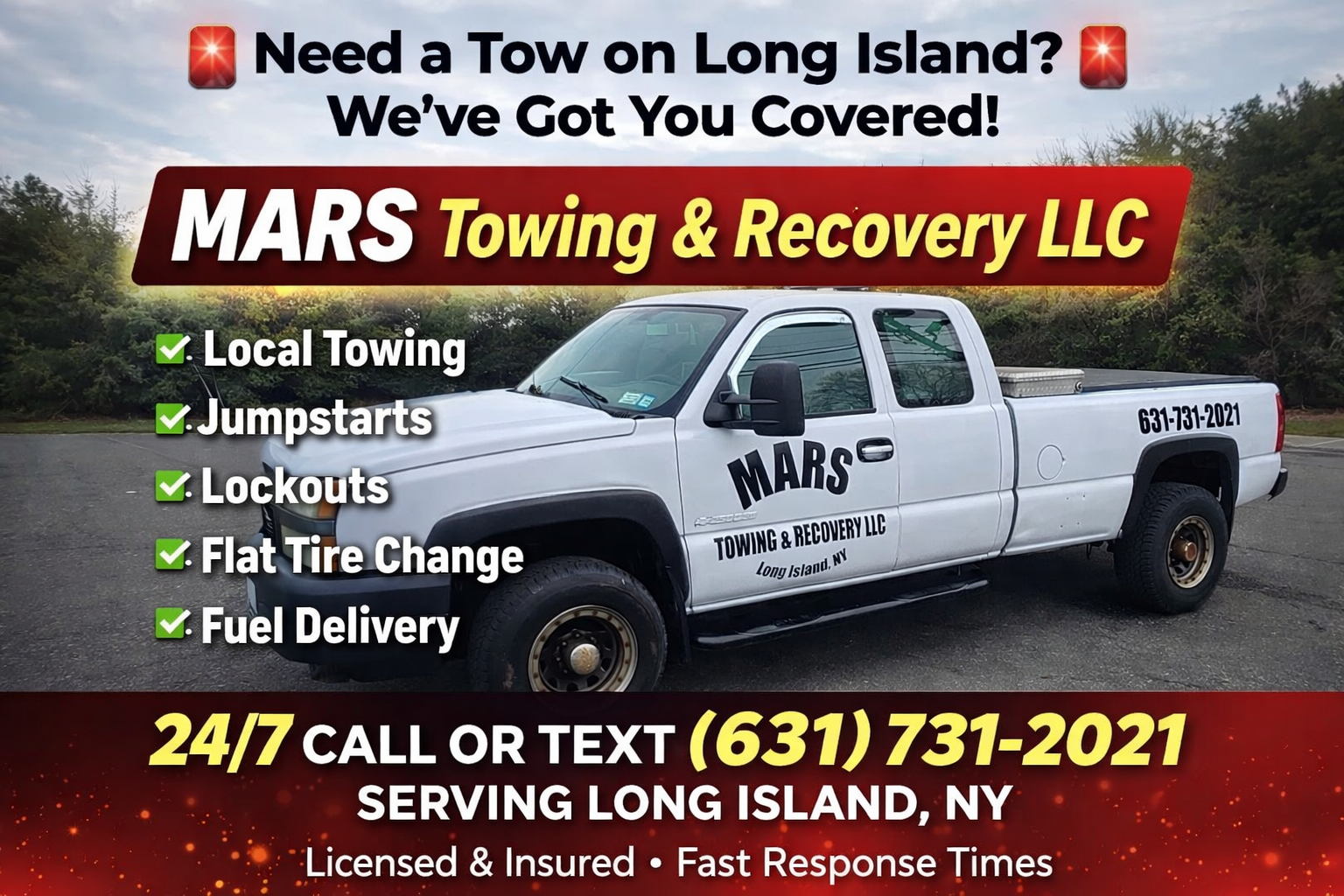 At Mars Towing & Recovery, we provide dependable vehicle towing and recovery services throughout Long Island. Our fully licensed and insured team is dedicated to offering prompt roadside assistance, including lockouts, jumpstarts, fuel delivery, and tire changes—all at reasonable rates. Trust us to be there when you need help the most, ensuring your safety and peace of mind on the road.